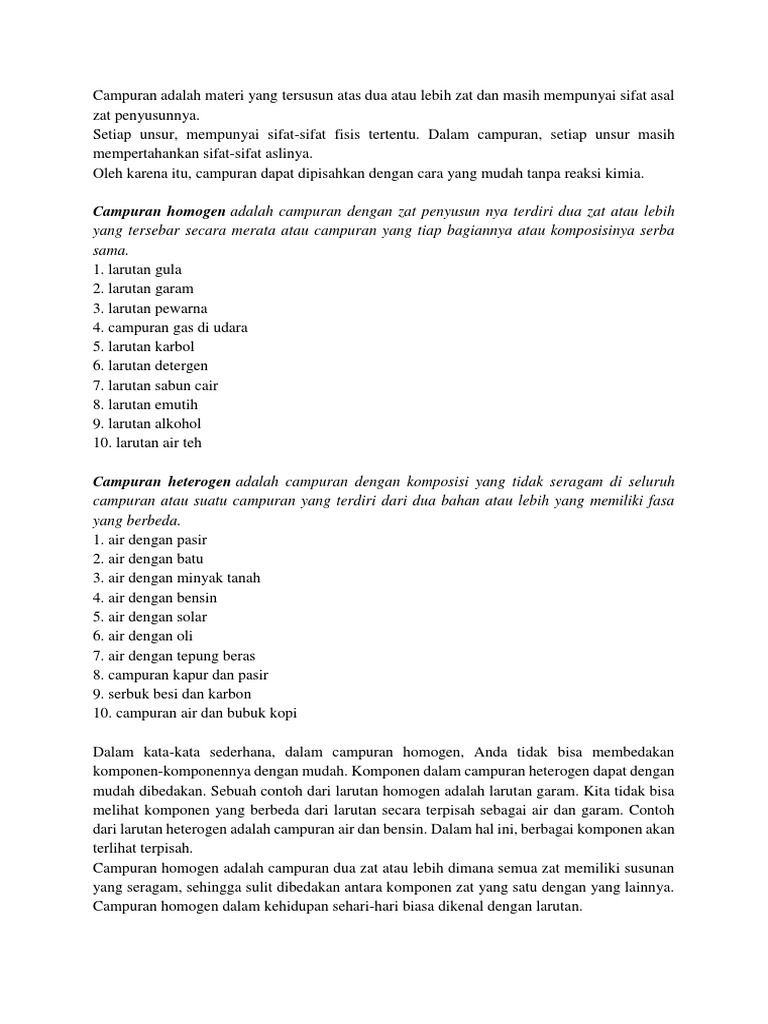 Gula ini dikenal dengan sejumlah nama, seperti gula jawa dan gula merah. Zat tunggal zat tunggal merupakan zat yang terdiri atas materi sejenis. Gula kelapa gula kelapa diproduksi dari nira kelapa. Rendah kalori dan kaya nutrisi. Campuran air dengan kopi, air dengan tepung, dan air dengan pasir. Gula pasir dapat diuraikan menjadi unsur karbon, hidrogen dan oksigen. Jadi campuran homogen yang terdiri atas beberapa zat ini ketika telah melebur menjadi satu campuran komponen penyusunnya sudah tidak bisa dibedakan lagi. Secara fisis dilakukan dengan cara penyaringan sedangkan secara kimia melalui pemanasan, dan pemberian bahan pengendap. Gula batu atau gula kristal adalah kembang gula bertekstur keras yang dibuat dengan proses kristalisasi larutan gula cair. Gula pasir gula pasir mempunyai nama kimia sukrosa dan rumus kimia. Gula digunakan sebagai pengimbang garam dan sekaligus penguat rasa. Gula dapat menjadi faktor risiko untuk kanker kandung empedu. Berdasarkan komposisi penyusunnya, materi dibedakan menjadi zat.