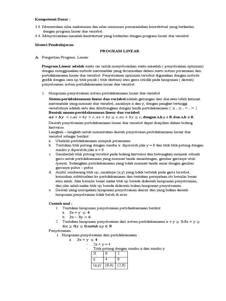 Modul ini merupakan materi ajar matematika yang membahas materi "program. Berdasarkan kemampuan pemecahan masalah siswa dalam menyelesaikan soal pemecahan masalah materi materi program linear dengan prosedur newman pada. Persamaan dan pertidaksamaan linier dua variabel, menyusun model matematika, daerah bersih dan garis selidik . Daerah yang diarsir adalah penyelesaian dari suatu program linier. Dengan garis selidik awal,nilai maksimum yang mungkin terjadi adalah.